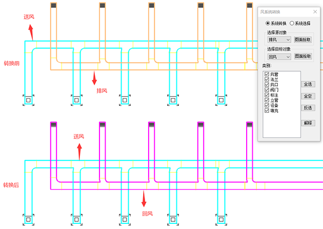 風(fēng)系統(tǒng)轉(zhuǎn)換命令,支持不同風(fēng)系統(tǒng)間的整體轉(zhuǎn)換,或整體選中。更高效,更快捷的在多個風(fēng)系統(tǒng)交叉的圖紙中選中所需要的風(fēng)系統(tǒng),進(jìn)行移動、復(fù)制或整體轉(zhuǎn)換風(fēng)系統(tǒng)類型等操作。