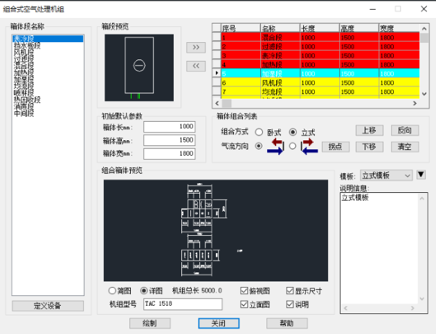 空氣機(jī)組命令支持模版的設(shè)置和保存。軟件中給出默認(rèn)立式和臥式模版,支持用戶手動添加。