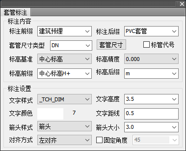 專業(yè)標(biāo)注模塊增加套管的批量標(biāo)注功能,自動識別套管和管線的信息,自動讀取標(biāo)高、支持設(shè)定說明文字等,一鍵批量生成引出標(biāo)注。