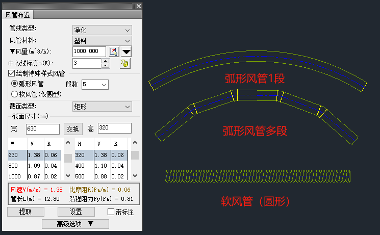風(fēng)管繪制對話框采用可折疊樣式,節(jié)省了繪圖空間、使重點(diǎn)參數(shù)突出顯示;風(fēng)管繪制提供保溫、防火、內(nèi)襯層的繪制、勾選,及材質(zhì)選定、厚度設(shè)定;風(fēng)管繪制可根據(jù)風(fēng)量和風(fēng)管設(shè)置中設(shè)置的風(fēng)管推薦風(fēng)速,計算出風(fēng)管的推薦截面尺寸;風(fēng)管繪制支持不同壓力等級繪制,后續(xù)風(fēng)管材料統(tǒng)計根據(jù)不同壓力等級區(qū)分風(fēng)管壁厚;圓形風(fēng)管支持軟風(fēng)管繪制。