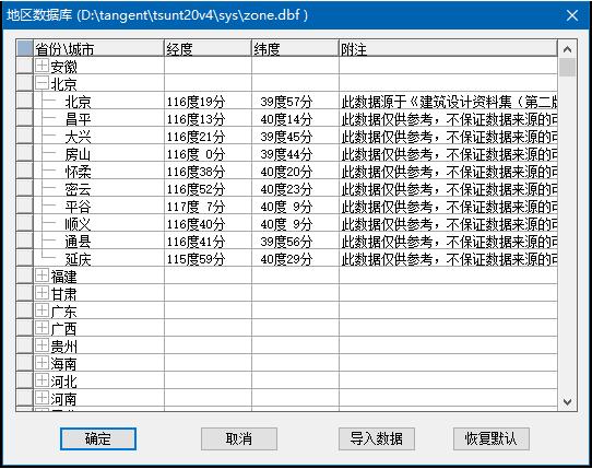 T20-Sun中提供全國(guó)各城市的經(jīng)緯度數(shù)據(jù)作為參考,并且可以進(jìn)行城市的添加編輯和修改,以符合當(dāng)?shù)厝照沼?jì)算要求。