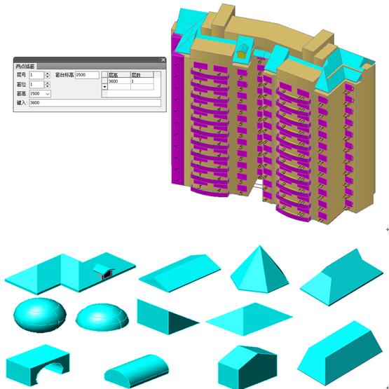 提供日照專(zhuān)用的任意屋頂、人字屋頂、攢尖屋頂、矩形屋頂、梯形屋頂功能,各種樣式屋頂直接支持日照分析計(jì)算。并且提供加老虎窗命令,可在三維屋頂生成多種老虎窗形式。