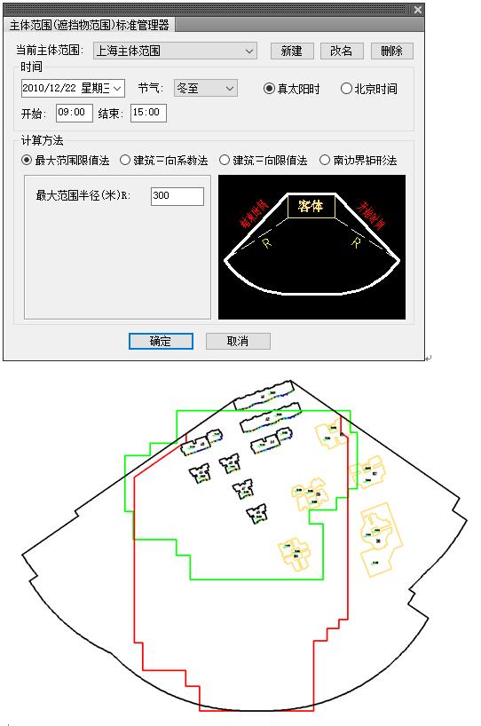 根據(jù)被陰影遮擋客體建筑物的位置,求出在指定日照時(shí)間段和特定計(jì)算規(guī)則下可能對(duì)其產(chǎn)生遮擋的主體建筑的范圍。用戶可以到“主體范圍標(biāo)準(zhǔn)管理器”中設(shè)置主體范圍計(jì)算規(guī)則,并可以導(dǎo)入導(dǎo)出標(biāo)準(zhǔn)參數(shù)。