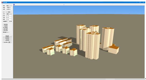 動(dòng)態(tài)改變被測(cè)試建筑物或者遮擋主體建筑物的位置和方位,實(shí)時(shí)顯示客體建筑物輪廓上采樣點(diǎn)或窗戶的日照時(shí)數(shù)。可動(dòng)態(tài)修改建筑高度或者拉伸輪廓形狀,動(dòng)態(tài)觀察建筑形體變化對(duì)日照時(shí)數(shù)的影響。